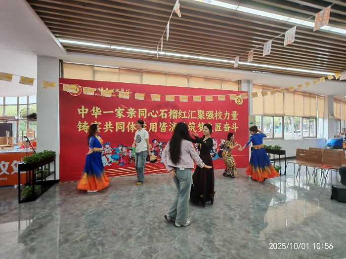 (本网讯 陈灏 唐振兵 宁曦  喻琳 )10月1日上午,“铸牢共同体金秋石榴中国红 · 奋进新征程感恩同行复兴梦”主题活动在各校区举行,师生代表、在校务工员工及子女等共聚一堂,载歌载舞共庆伟大祖国华诞,共话奋斗凝聚强校复兴力量。