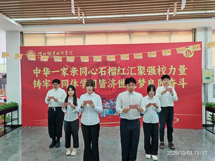 校文昌诗社、晨曦民族交流协会、2024级黄思禹同学说:“红色基因融国庆,文化非遗入中秋,我们相聚在一起,同唱一支歌,共跳一支舞,湖北职院是我们共同的精神家园,我们将牢记习近平总书记考察湖北亲临孝感时的重要讲话精神,铸牢中华民族共同体意识,打造湖北职院铸牢共同体实践高地。”