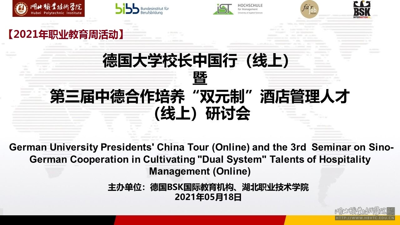 (本网记者:致和 陈灏)值2021年全国职教活动周来临之际,2021年德国大学校长中国行暨第三届中德合作培养“双元制”酒店管理人才研讨会于5月18日下午在我校顺利召开。本次会议由乐动网页版与德国BSK国际教育机构共同主办,采用线上线下相结合的方式进行,主会场设在我校文德楼二楼会议室。