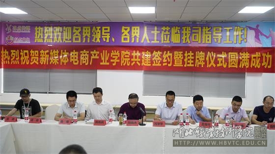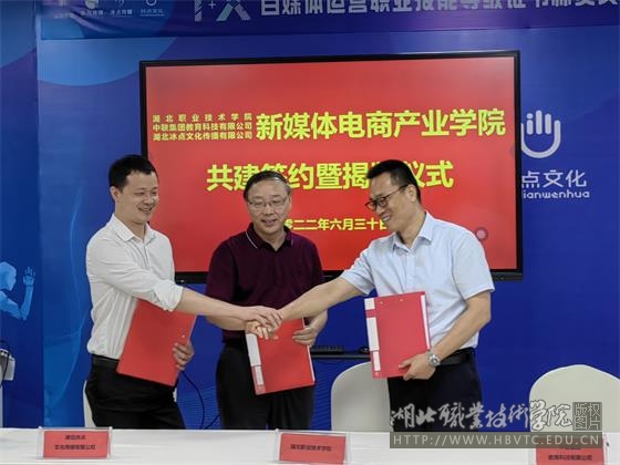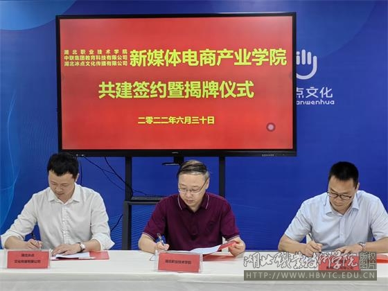 (本网讯 通讯员 马江浩)6月30日,新媒体电商产业学院(以下简称产业学院)签约暨揭牌仪式在南校区天工楼顺利举行。产业学院由学校与中联集团教育科技有限公司、湖北冰点文化传播有限公司共同建设。学校副校长胡昌杰,中联集团教育科技有限公司副总裁冯学平,湖北冰点文化传播有限公司总经理熊传兵及学校相关职能部门负责同志、财经学院师生代表等出席,揭牌仪式由财经学院院长徐斌华主持。