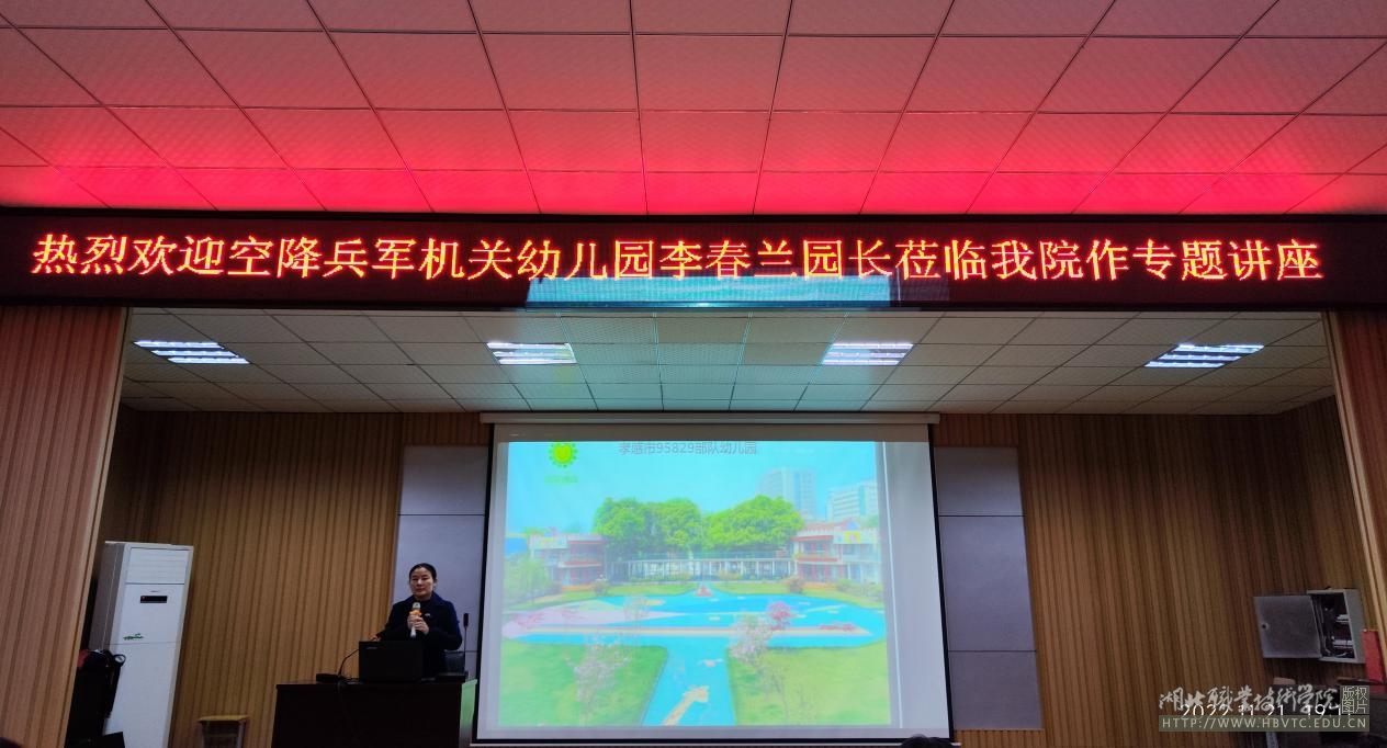 (本网讯 彭琳君)师幼关系是教师与幼儿在共同的教育教学活动中形成的一种人际关系.良好的师幼关系能给幼儿带来快乐,温馨,轻松,愉悦,无拘无束和积极向上的健康心理,有利于教育教学工作的顺利进行。为了让学前教育专业学生树立正确地职业观、教育观,11月21日晚特邀孝感市95829部队幼儿园李春兰园长在教育与艺术学院为学前学生带来一堂关于“示范园园长眼中受欢迎的幼师”的专题讲座。
