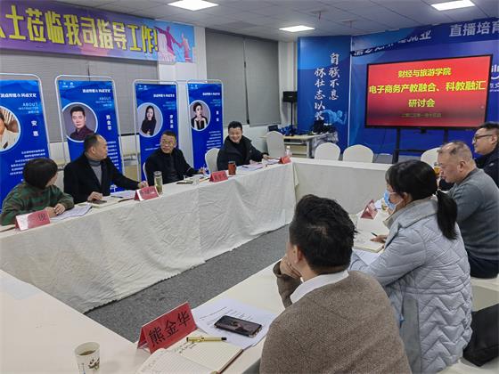 (本网讯 宋巍)1月13日,财经与旅游学院在学校南区天工楼冰点产教融合电商直播基地举行电子商务产教融合、科教融汇研讨会,学校教务处黄享苟处长、湖北冰点文化传播有限公司熊传兵董事长、董俊总经理、财经与旅游学院徐斌华院长及教学管理核心团队参加了本次研讨会。会议由徐斌华主持。