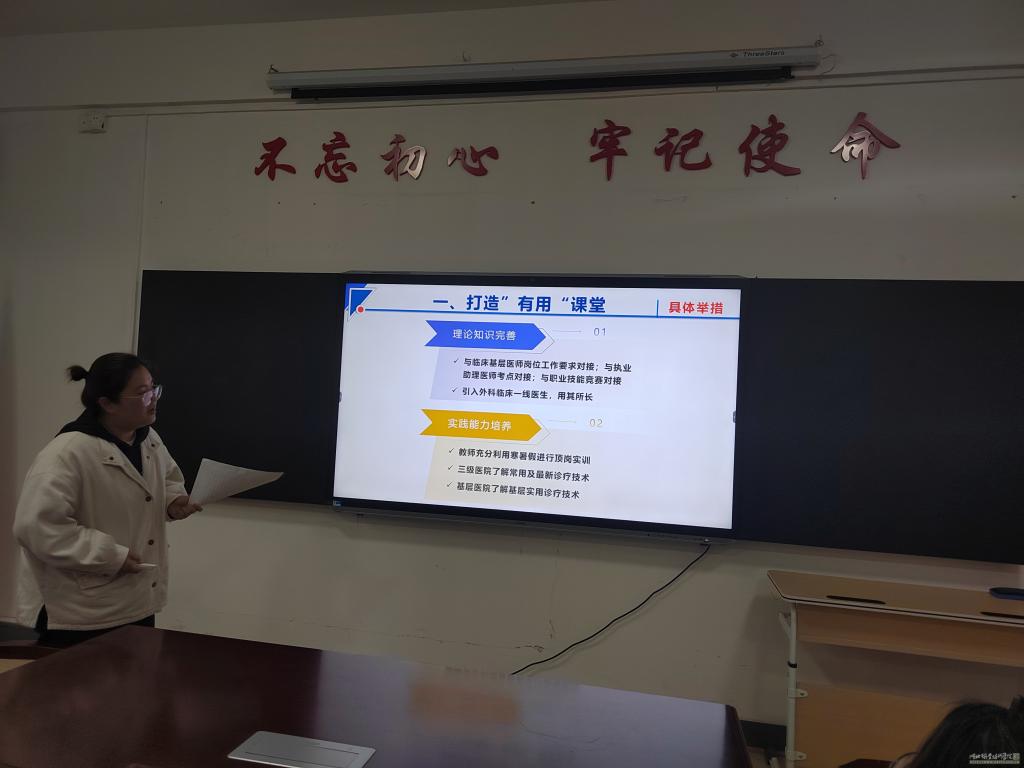 会上,高保英等8位教师围绕“深教改 强质量”主题,从专业或课程层面分析了当前教学工作中存在的问题,提出了课堂革命的具体措施,展望了教学改革的预期成果。药学教研室主任高保英介绍了药学专业升本建设的改革内容和工作举措,医学影像技术教研室主任陈新祥深挖了教育改革的内涵,临床医学教研室主任王丹、全科医学教研室主任陈琛从具体课程出发阐述了如何打造有爱、有料、有趣、有效的“四有”课堂。刘任田老师把社会实践融合入课堂教学,关注生命教育观;胡亮亮老师深入分析课堂革命的背景,将教学内容与执业助理医师考试紧密结合;彭俊珍老师精准把握学生思想动态,多措并举改进教学方法;杨娟元老师以学生学习产出为导向,着力于提升学生学习积极性和解决问题能力。教师代表唐前、李凌云老师就本次教研活动分别发表了交流意见和感想。