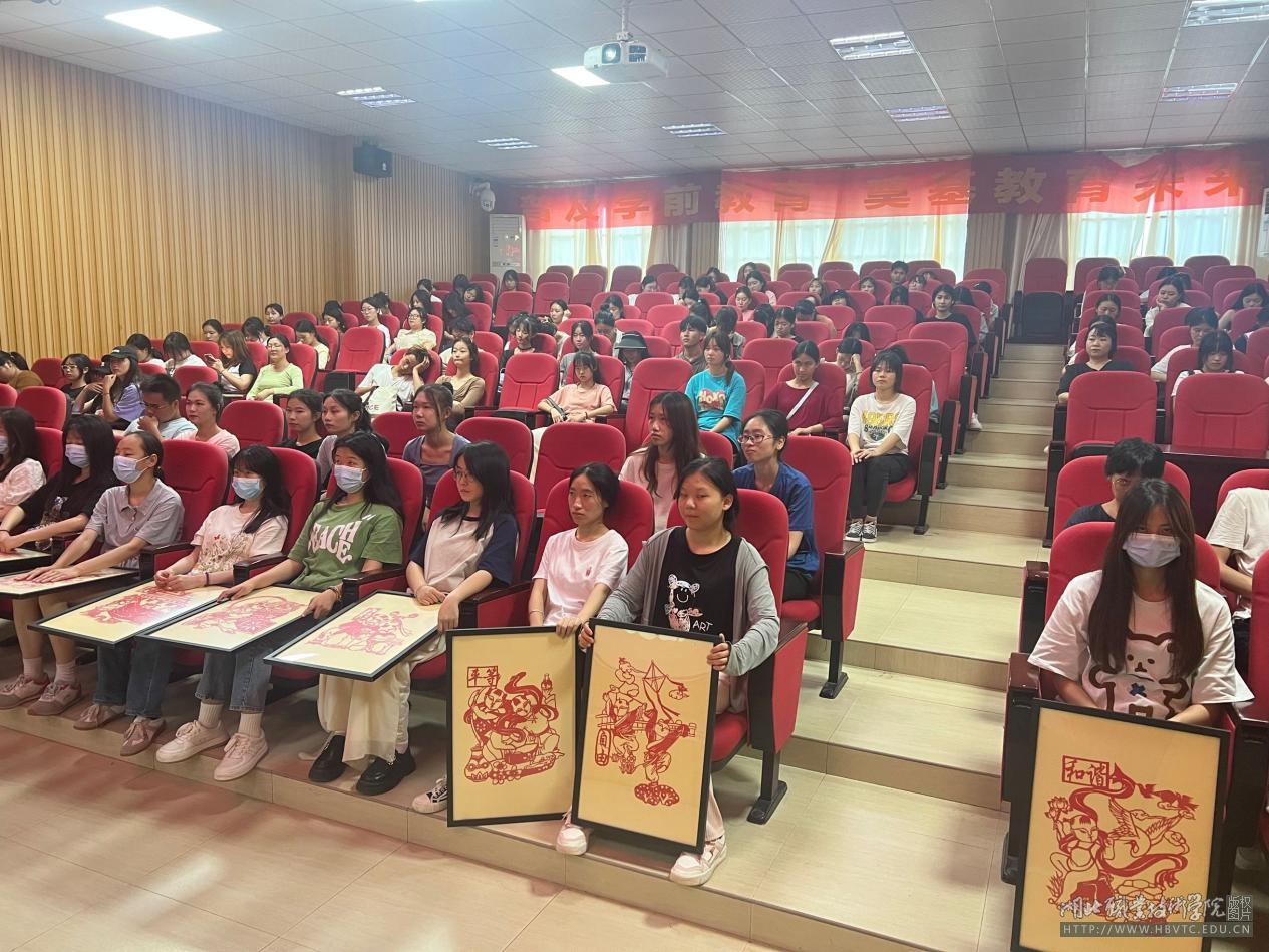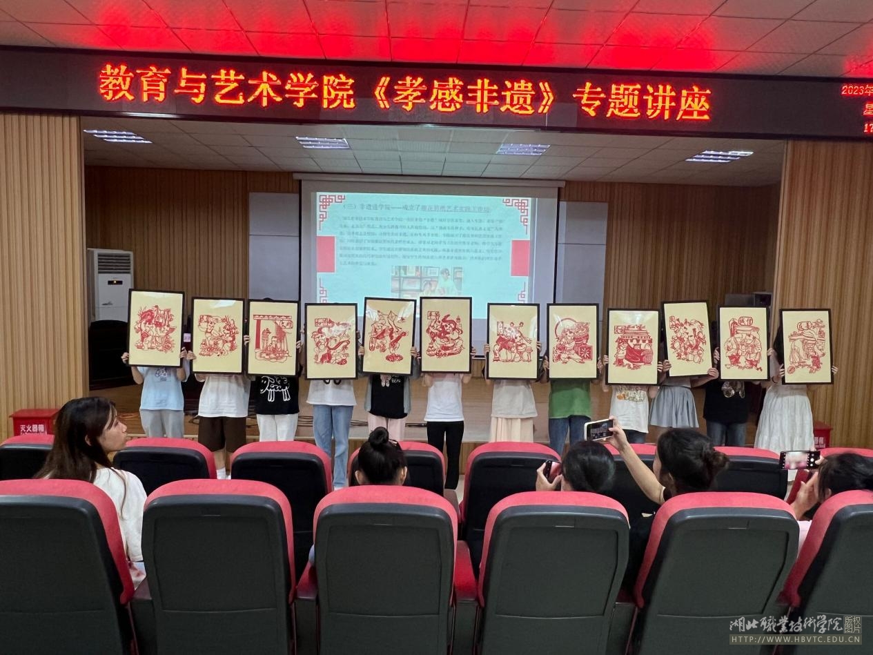 近年来,教育与艺术学院围绕职业教育特点和人才培养需求,一直注重将传统戏曲、民间手工艺、民间美术等丰富多彩的“非遗”项目引进课堂、融入生活,采取“请进来、走出去”方式,充分发挥教书育人阵地作用,常态化开展各类展览、展演、培训等活动。建立了孝感“雕花剪纸”大师工作室、学生“雕花剪纸”艺术实践工作坊,从选修课逐步渗透到必修课,从日常普及深化为课题研究,在非遗传承与保护中寻求人才培养和文化传承的契合点,充分打造人文特色、艺术品质校园。