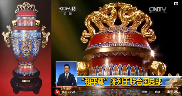 (“和平尊”以中国非物质文化遗产景泰蓝工艺制成,顶部龙饰象征守望和平)