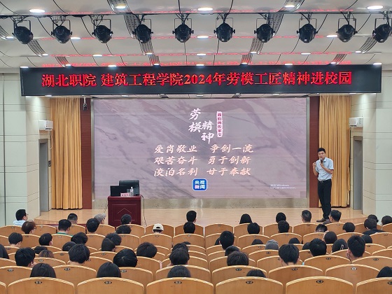 (本网讯 刘顿)5月10日,建筑工程学院在西校区文博馆学术报告厅举办“劳模工匠精神进校园”活动,孝感市劳动模范、中交第二航务工程局有限公司第五工程分公司项目经理陶张志应邀为师生作报告。全国道德模范谭之平、建筑工程学院学工党支部全体党员、“双带头人”工作室成员、各族学生参加活动。