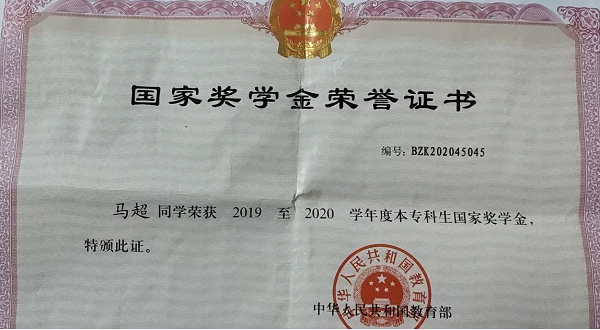马超获得2019至2020学年度国家奖学金