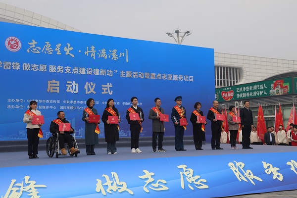 (本网讯 陈灏 综合报道)3月1日,2025年孝感市“学雷锋 做志愿 服务支点建设建新功”主题活动暨重点志愿服务项目启动仪式在孝感东站站前广场举行。市委书记胡玖明,市委副书记、市长吴庆华,市委常委、宣传部部长吴琼,我校党委书记郭国文等出席启动仪式。我校荆楚石榴红志愿服务队“爱老敬老 孝满澴川”志愿服务项目、精诚康复志愿服务队“健康基层行 志愿暖民心”志愿服务项目成功入选2025年孝感市级重点志愿服务项目并现场开展志愿服务。我校多支志愿服务队参加启动仪式。