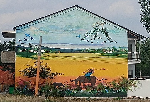 4月底至5月16日,湖北职院建筑工程学院邓海波博士带领汤进峰、严俊峰、张敏华3位副教授及建筑装饰技术专业5名学生,往返于学校和朝阳村。利用十余天时间,经过实地调研、现场测量、墙画设计、搭设脚手架、配料调色、墙画绘制、墙画优化等步骤,完成了《孝行牧歌》墙画创作。