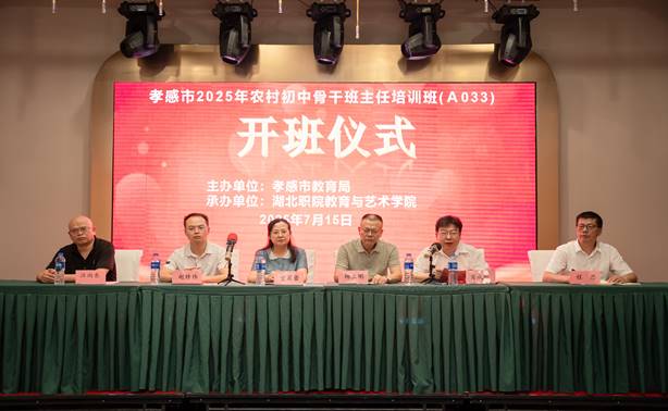 (本网讯 赵晴晴)7月15日上午,由孝感市教育局主办、我校承办的"2025年'国培计划'孝感市农村初中骨干班主任培训"开班仪式举行,来自孝感市各县区的60名初中骨干班主任将开启为期9天的集中研修+6天的跟岗实训+全程网络研修。孝感市教育局教科院副院长管菊蕾、基础教育科科长赵修伟,我校副校长杨立明,继续教育学院副院长汪向东、教育与艺术学院院长肖成林、党总支书记程思等出席仪式。开班仪式由肖成林主持。