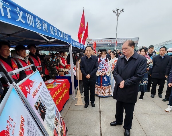 (孝感市委书记胡玖明对熊文文先进事迹作出批示。图为胡玖明等参观熊文文志愿服务成果)