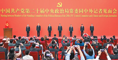 10月23日,刚刚在中国共产党第二十届中央委员会第一次全体会议上当选的中共中央总书记习近平和中共中央政治局常委李强、赵乐际、王沪宁、蔡奇、丁薛祥、李希在北京人民大会堂同采访中共二十大的中外记者亲切见面。